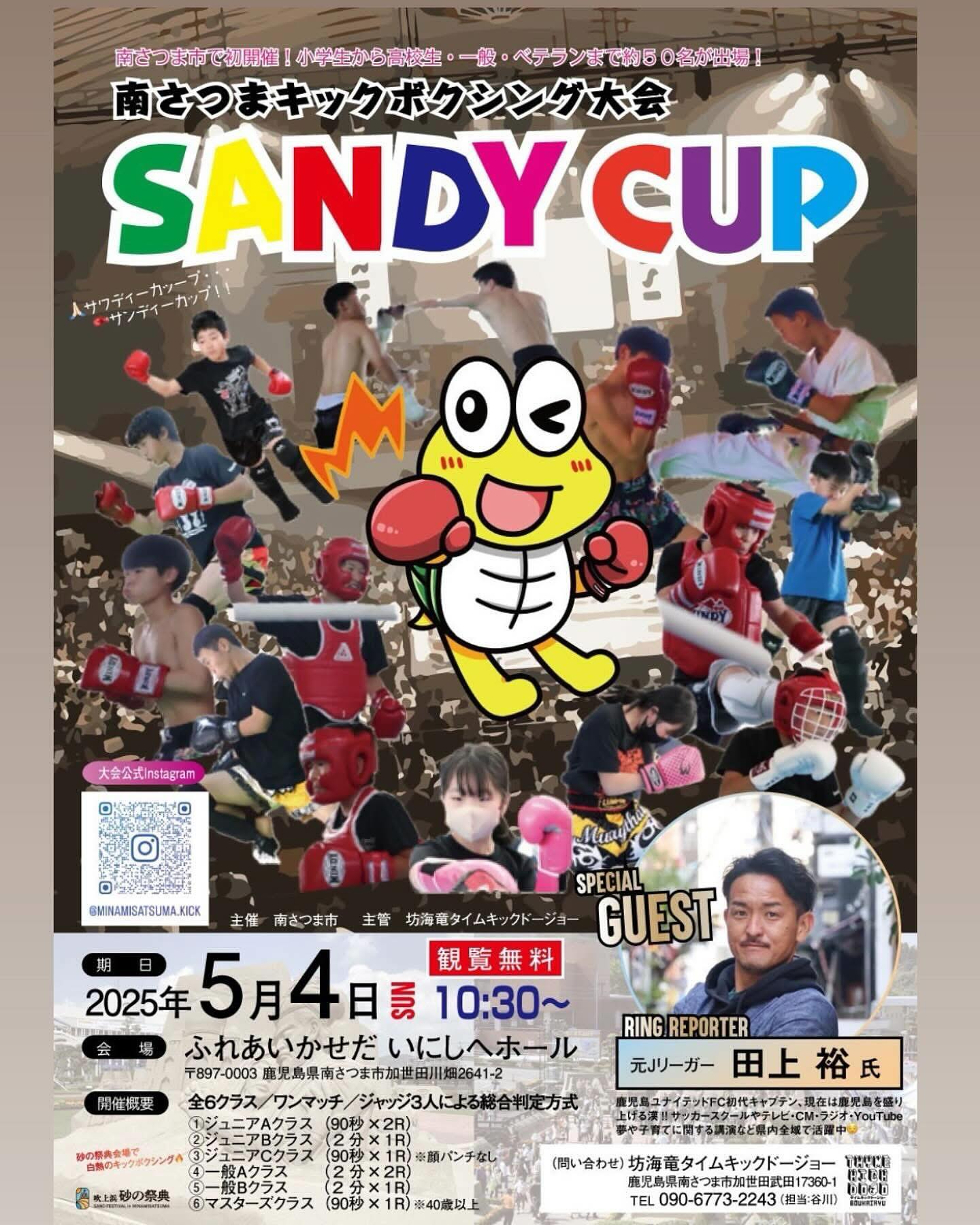 めったに観られない迫力、1日限りのキックボクシング大会!無料 南さつま市で初の開催となる南さつまキックボクシング大会「SANDY CUP」。小学生から高校生・一般・ベテランまで焼く50名が出場します。息づまる攻防が生む熱気を、その目で体感してください。当日は、元Jリーガー田上 裕さんがスペシャルゲストとして来場されます! 開催概要 全6クラス/ワンマッチ/ジャッジ3人による総合判定方式です。 ジュニアAクラス(90秒×2R) ジュニアBクラス(2分×1R) ジュニアCクラス(90秒×1R)※顔パンチなし 一般Aクラス(2分×2R) 一般Bクラス(2分×1R) マスターズクラス(90秒×1R)※40歳以上 画像はクリックで拡大してご覧いただけます。 詳細情報 日付2025/5/4(日)時間10:30〜場所市役所エリア ふれあいかせだいにしへホール(南さつま市加世田川畑2641-2)料金無料 同じエリアのイベント ミュージック&ライティングショー・花火市役所ステージイベント砂像制作体験くじらバスツアー各種展示ブースおもしろ自転車コーナーミニサンドボトル体験オリジナルトートバック制作自衛隊車両の展示と制服試着体験バルーンアートトヨタ電動モビリティ体験スタンプ作り体験【イベント終了】感電体験、手回し発電ぬいぐるみレース