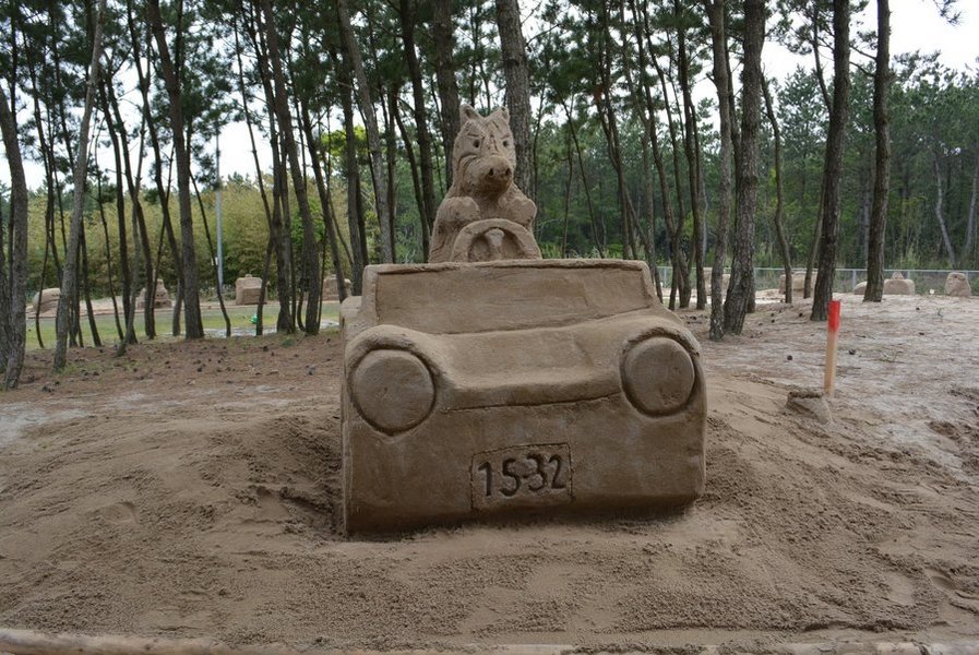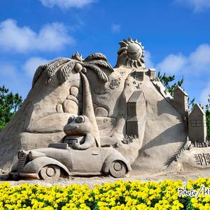 砂像テーマ:「ハッピードライブ ~時代を映すのりものの世界~」のメイン砂像をご紹介いたします。
