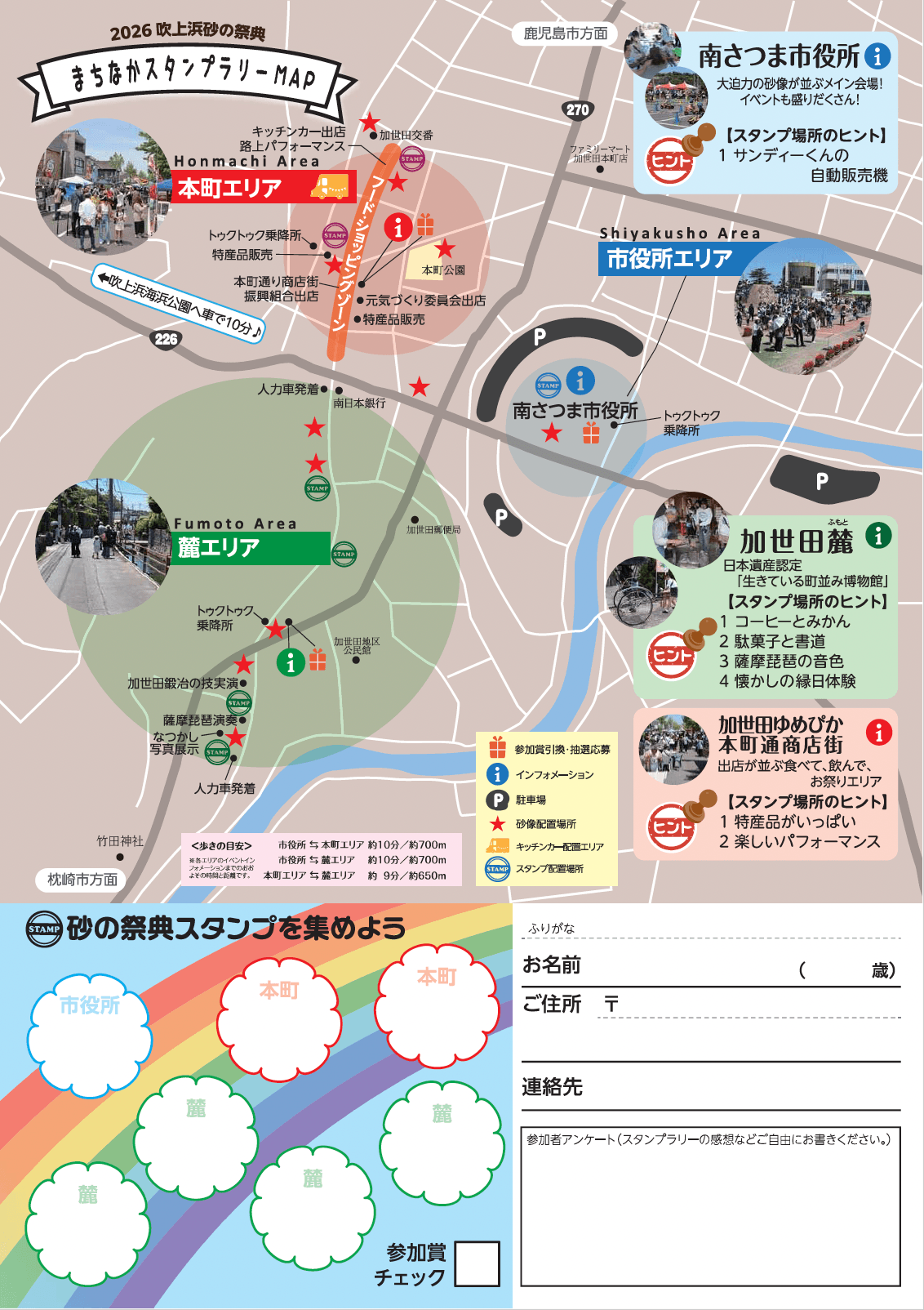 砂の祭典会場の各エリアに設置されたスタンプ7個(市役所エリア1個、本町エリア2個、麓エリア4個)のうち、各エリアのスタンプを1個以上ずつ集めると、参加賞をプレゼント!